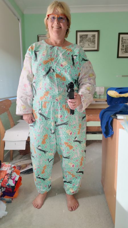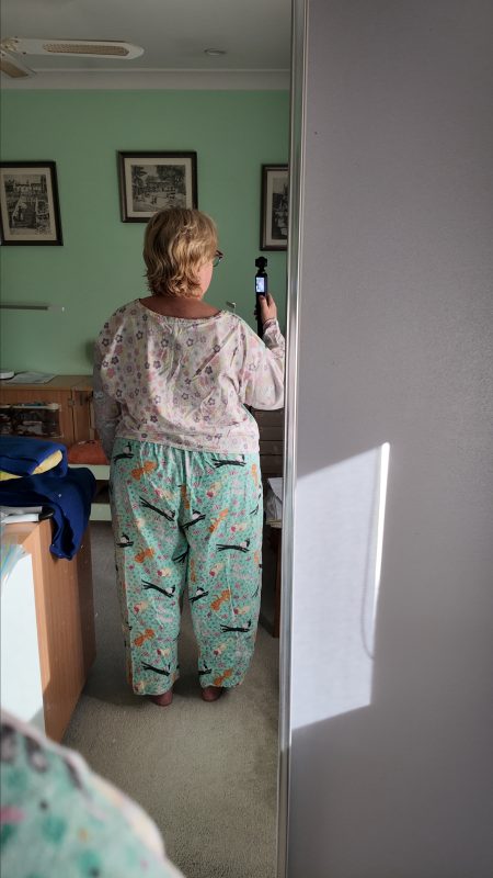 The initial project based on this pattern involved creating three pairs of flannelette pyjama pants. With the leftover fabric, I crafted a pyjama top that features two different designs for the body and uses the remaining fabric for the sleeves. This is a great way to utilise surplus fabric.